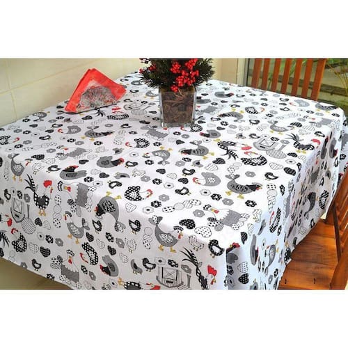 Toalha de mesa confeccionada em tecido poliéster, com estampa de fundo branco e várias galinhas, pintinhos, galos ,coração e flores desenhados nas cores branca, preta, vermelha e laranja.