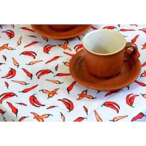 Toalha de mesa confeccionada em tecido poliéster, com estampa de fundo palha e muitas pimentinhas vermelhas desenhadas.