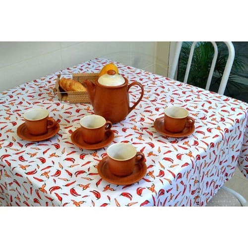 Toalha de mesa confeccionada em tecido poliéster, com estampa de fundo palha e muitas pimentinhas vermelhas desenhadas.