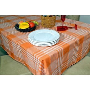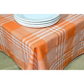 Toalha de mesa em tecido oxford importado, com desenhos de várias listras nas cores laranja e branco, acabamento em bainha em toda lateral.