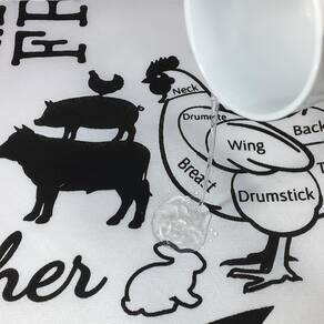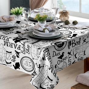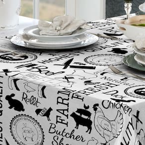 O tecido coma tecnologia Limpa Fácil promove praticidade para o dia a dia permitindo assim, facilidade na limpeza, pois suja muito menos, espaçando o tempo entre uma lavagem e outra. A estampa churrasco, traduz uma atmosfera convidativa a organização da mesa posta. No Bicolor preto e branco, a sofisticação da temática é uma releitura de espaços gourmet e fins de semana.