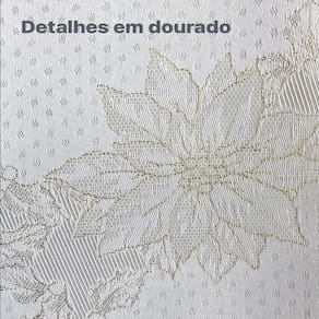 Confeccionada em tecido jacquard com brilho sutil, a toalha apresenta uma estampa rica em detalhes: delicadas flores e arabescos entrelaçados com fios de lurex dourado, que refletem a luz com um toque de requinte. O fundo perolado com discreto poá em relevo complementa a composição, oferecendo uma aparência sofisticada sem exageros.