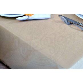 Toalha de mesa em tecido oxford liso, 100% poliéster, na cor bege, com acabamento em bainha em todas as laterais.
