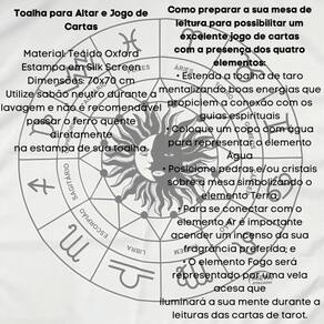 A Toalha Jogo de Cartas Zodíaco da Bialluz é ótima para te auxiliar durante o jogo de cartas, por ser um elemento que proporciona alta elevação enérgica. Você também pode usar para decorar seu altar, com certeza ficara ainda mais lindo e com muita energia positiva. Nossa toalha possui altíssima qualidade na impressão com pontos de brilho e é confeccionada em tecido oxford que não amassa e tem longa durabilidade.