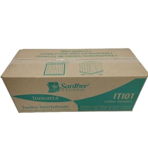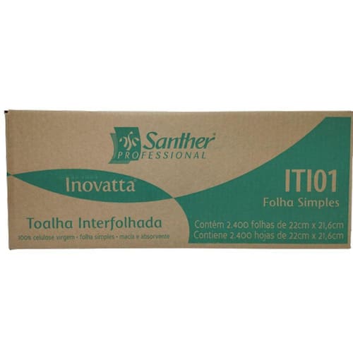 Toalha de Papel Inovatta Folha Simples Interfolha 2400 folhas 10x240fl Papel Toalha para mãos InterfolhadaFolha Simples INOVATTAITI 01Característica do ProdutoEste produto é produzido com 100% FIBRAS VIRGENS 100% Celulose não transgênicas.Possui excelente alvura e maciez, bem como boas propriedades de resistência ao estadoÚmido e exclusiva tecnologia que deixa o papel muito mais macio e mais absorvente. NãoCausa irritações dérmicas.Código ITI 01 - INOVATTA Toalha Interfolhada Folha Simples Cor BrancoGramatura / Alvura 34 - 36g/m Largura da Folha 220 mmComprimento da Folha 216 mmValidade Indeterminado - Produto não perecívelTipo de Embalagem Pacote plástico totalmente fechado Marca: Santher Professional