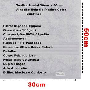 Toalha Social Buettner Platine Algodão Egípcio Color 30x50cm Prata Toalha Social (Lavabo) felpuda, 100% Algodão Egípcio no tamanho 30cm x 50cm com 500g/m da linha Nobre e da marca Bouton, modelo Platine, produzida em teares especiais que possibilitam desenvolver desenhos tanto no corpo quanto nas barras das toalhas. A toalha Platine possui corpo liso com bastante felpa e uma barra discreta e suave com linhas horizontais, apenas para dar um charme ao expor ela. Seu corpo liso possui alta absorção, e sua barra minimalista possui detalhes horizontais, destacando um tom de charme e nobreza, proporcionando uma linda exposição no banheiro, traduzindo refinamento e muita sofisticação ao ambiente. Suas cores buscam remeter aos tons nobres da estação. Toalha Social Buettner Platine Algodão Egípcio Color 30x50cm Prata
