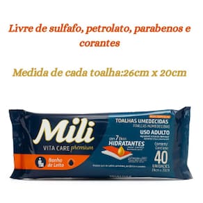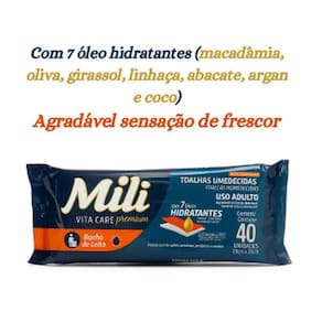 Toalhas Umedecidas Mili Vita Care Premium 12 pacotes c/ 40 unidades (total: 480 lenços umedecidos) Medida de cada toalha:26cm x 20cm Com 7 óleo hidratantes (macadâmia, oliva, girassol, linhaça, abacate, argan e coco) Produto livre de sulfato, petrolato, parabenos e corantes Agradável sensação de frescor Indicado para banho de leito, e atletas. Dermatologicamente testado