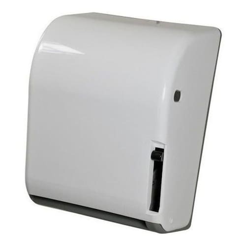 Toalheiro em ABS para papel bobina até 200m possui alavanca que auxilia a liberação do papel, evitando o desperdício.