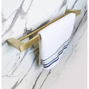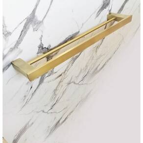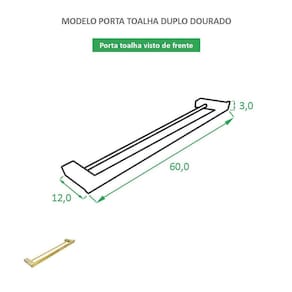 Modelo: Toalheiro Duplo de Banho Quadrado Altura: 3 cm Comprimento: 60 cm Largura: 12 cm Material: Aço Inox de alta qualidade Cor: Dourado Acabamento: Escovado