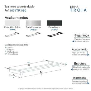 O toalheiro suporte duplo da linha Troia possui um design atemporal, é uma peça que se destaca com imponência e modernidade. Além de decorar, organiza com funcionalidade o banheiro. Criado em metal nobre com uma qualidade que abrange áreas litorâneas e possui a de um acabamento muito resistente. Agora é só você adquirir este lindo acessório e fazer o seu projeto se tornar realidade com um banheiro prático para toda a sua família. Características Fabricado em metal alumínio. Disponível no Prata Alto Brilho, Escovado e Preto Fosco. Pode ser instalado em parede, azulejo e porcelanato. Benefícios Fixação prática e segura com parafusos e buchas inclusos. O produto não possui nenhum detalhe em plástico ABS . Fácil higienização, ideal para locais que exigem limpeza constante. Aproveitamento inteligente do espaço, ideal para ambientes compactos. Resistente à corrosão e luz solar. Itens ENVIADOS: 1 toalheiro duplo 60cm, kit de parafusos e manual instrução instalação. Instalação INTELIGENTE Ao 1º furo, use uma broca medida menor, após use a medida correta e finalize, vai ajudar na precisão da fixação da bucha principalmente em azulejos e porcelanato.