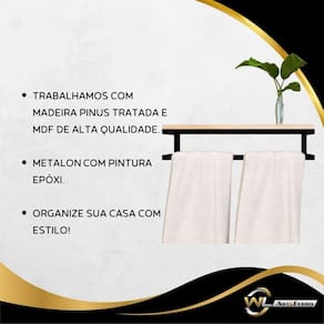 Este suporte para toalha combina a robustez do metalon com a beleza natural da madeira de pinus, proporcionando um suporte elegante e funcional para toalhas no ambiente do banheiro.