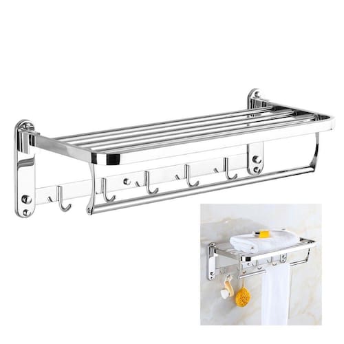 Dobrável, economiza espaço, suporte até 15 kg e ganchos para guardar e secar suas toalhas.