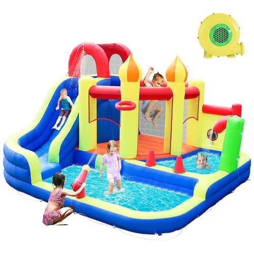 O Blow Up Water Slides for Kids Backyard, Large Jumping Bouncy Castle 8in1 da JOOLOOG é feito principalmente de materiais resistentes a furos, combinando tecidos Oxford de alta densidade, como 840D e 420D Oxford, que são duráveis e adequados para uso externo. Esses materiais são reforçados com costuras duplas e proteções em áreas de maior desgaste para garantir segurança e longevidade do produto. Além disso, o brinquedo conta com redes de proteção para evitar quedas acidentais.