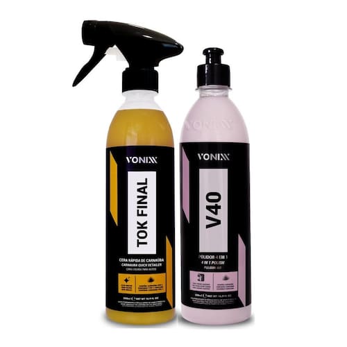 Tok final + v40 Kit tok final 500ml + polidor v40 Carnaúba tok final Cera de manutenção em spray Tok final foi desenvolvida com a mais pura cera de carnaúba cearense e polímeros de última geração, que protegem e realçam o brilho de pinturas automotivas. É ideal para ser Utilizado após a lavagem e na manutenção da proteção da pintura do veículo entre os enceramentos. Pode ser aplicada em toda parte do veículo, incluindo vidros, para-choques e borrachas. Diluição Pronto uso. Durabilidade Até 30 dias de proteção. Informações adicionais Carnaúba tok final é ideal para a manutenção entre as lavagens, principalmente para manter o brilho e proteção da cera hybrid wax ou canaúba express ultra. Modo de uso: 1.Agitar bem o produto antes de usar. 2.Após lavar e secar o veículo, pulverizar o produto puro na superfície em área não superior à 60cm x 60cm. 3.Em seguida, realizar o acabamento com toalha ou pano de microfibra até obter o brilho desejado. 4.Repetir o procedimento até a conclusão do veículo. Isenta de abrasivos Contém a mais pura cera de carnaúba cearense Ideal para manutenção V40 Polidor 4 em 1 Descrição V40 é um polidor 4 em 1, desenvolvido para uso em vernizes asiáticos ou macios. Sua fórmula exclusiva permite uso nas três etapas de polimento, mediante a troca de boinas, promovendo leve proteção da cera de carnaúba. Diluição Pronto uso. Uso recomendado Pintura, superfície cromada, black piano, rodas. Boina ideal para etapa de refino Use a boina indicada para cada etapa. Trabalhe em áreas de 50 cm x 50 cm. Realize passadas cruzadas e sobrepostas até que o produto forme uma película fina e transparente sobre a peça. Rotação de trabalho politriz rotativa/ roto orbital Politriz rotativa: velocidade de trabalho, 800 a 1.400 rpm. Politriz roto orbital: velocidade de trabalho de 1.600 a 4.800 opm Informações adicionais Após o polimento com o v-40, indicamos a aplicação de ceras ou selantes especiais para a proteção da pintura. Para carros de cores escuras e tons vibrantes, a vonixx oferece duas opções: selante sintético v-80 ou native paste wax - black edition. Carros de cores claras e tons suaves indicamos a blend paste wax ou native paste wax. Não utilize este produto sob o sol ou se a superfície a ser polida estiver aquecida. Evite o contato do material com superfícies plásticas, couro e vidro. Caso isso aconteça, limpe imediatamente a área afetada com uma toalha de microfibra vonixx. Precauções Cuidado perigosa sua ingestão. Evite contato prolongado com a pele. Lavar as mãos após o uso. Conserve fora do alcance das crianças e animais domésticos. Leia atentamente o rótulo antes de utilizar o produto. Pode ser na três etapas do polimento Promove proteção da cera de carnaúba Promove excelente acabamento