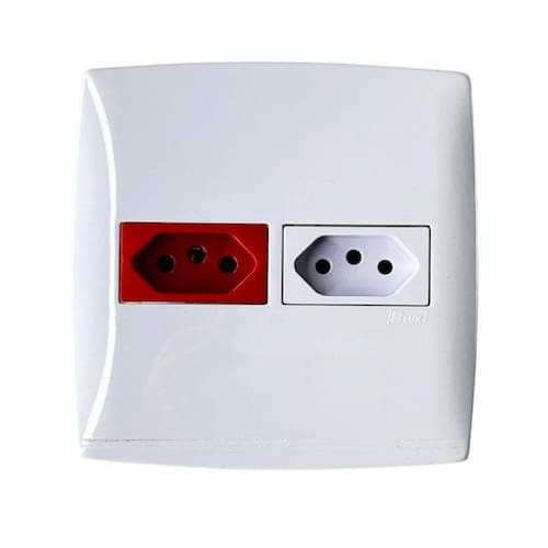 Tomada dupla, com 01 módulo 220v na cor vermelha e outro módulo simples para ligações 110v na cor branca.O módulo vermelho, assim como padronizado, tem entrada para aqueles pinos mais grossos ou mais espessos, aqueles pinos com 4.8mm de espessura, que é comum de se encontrar em secadores de cabelos, em algumas máquinas de lavar roupa, freezer, estufas. Já a tomada ao lado é para aparelhos de 110v simples, como uma televisão ou um aparelho de som, fogão, etc... As tomadas são de fabricação nacional, seguindo o padrão exigido pelas autoridades, seguindo normas já estabelecidas por entidades como a abnt e inmetro, ou seja, comprando um produto como estas tomadas da blux, você leva tranquilidade para sua casa e segurança nas suas instalações elétricas.