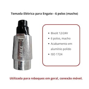 Tomada 6 polos alumínio para carretinha engate reboque macho dni8327 A parte que mais sofre em um conjunto de reboque é, sem dúvida, o plug macho. Ele cai no chão, é arrastado, recebe pancadas... Se o seu for de plástico, você já sabe o resultado: trincas e quebras constantes, deixando você na mão com a sinalização. A tomada macho de alumínio dni 8327 é a resposta para esse problema. Projetada para ser um upgrade direto, ela substitui a frágil peça de plástico por um corpo sólido de alumínio polido, garantindo uma durabilidade incomparavelmente maior e um encaixe muito mais firme. - construção robusta em alumínio: enquanto os plugs de plástico ressecam e quebram, o corpo de alumínio deste plug resiste a impactos, quedas e às condições climáticas mais severas. É a tranquilidade de ter uma peça feita para durar. - reposição inteligente apenas o macho : este produto é apenas a tomada macho, a parte que fica na ponta do chicote do seu reboque. Ideal para quem precisa substituir apenas a peça que sofreu danos, sem o custo de comprar um kit completo. - padrão nacional de 6 polos: essencial para reboques e carretinhas que utilizam o sistema de 6 vias para a sinalização básica lanterna, freio, setas e terra . Garante a conexão correta com veículos equipados com a tomada fêmea de 6 polos. Característica - marca: dni - código: dni8327 - conteúdo do kit: 1 tomada macho + 1 tomada fêmea ambas de alumínio - número de polos pinos : 7 - material: alumínio polido de alta resistência - tensão de operação: bivolt 12v / 24v - formato: redonda Aplicação: Universal Tempo : 6 meses Itens inclusos: - 1 tomada reboque ------------------------------------------------------------------------------ - a ampec autopeças não se responsabiliza pelo mau uso ou instalação indevida do produto, sempre recomendamos que a instalação seja feita por um especializado. - o produto é novo Sim, não trabalhamos com produtos , remoldados ou remanufaturados. -tem disponibilidade do produto Temos disponibilidade de todos nossos produtos enquanto durarem os estoques, favor nos consultar antes da compra. - imagem ilustrativa utilizada para identificação e demonstração de produto. - as marcas e modelos citadas no anúncio, pertencem aos seus respectivos fabricantes, somente mencionadas como referências para o uso correto do produto, conforme artigo 31 da lei: 8078 de 11.09.1990 Não temos qualquer vínculo com estas empresas. Marca: Não Informado