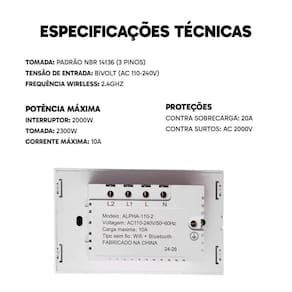 Tomada: Padrão NBR 14136 (3 pinos) Tensão de entrada: AC 110-240V (bivolt) Frequência wireless: 2.4GHz Potência máxima: Interruptor: 2000W Tomada: 2300W Corrente máxima: 10A (interruptor e tomada) Proteção contra sobrecarga: 20A Proteção contra surtos: AC 2000V Proteção contra incêndio: Até 850C (fio incandescente) Material: Policarbonato e componentes eletrônicos Conectividade: Controle remoto via aplicativo Compatibilidade: Amazon Alexa Google Assistant