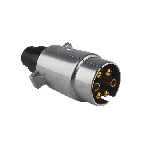 Características do produto: tipo: tomada elétrica de engate modelo: macho - 6 polos material: alumínio tensão: bivolt - 12v / 24v uso: ideal para reboques, trailers, carretinhas e conexões móveis