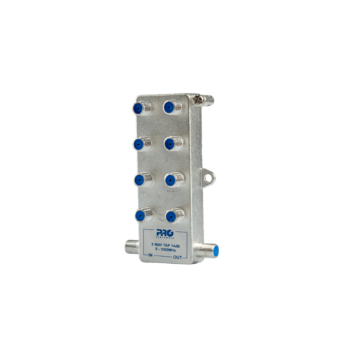 Tomada TAP 1:8 5-1000MHz 14dB: Acoplador de sinal RF com 1 entrada e 8 saídas, atenuação de 14dB e frequência de operação de até 1GHz. Ideal para distribuir sinal de TV a cabo e outros sinais de RF, garantindo uma transmissão estável e de alta qualidade.