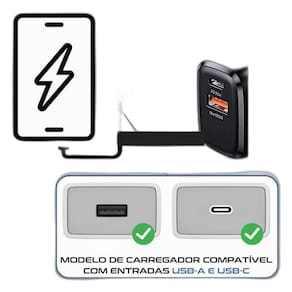 Tomada USB com carga turbo, alta compatibilidade com USB-C, V8 e Lightning. Inclui adaptador de cabo exclusivo para compatibilidade geral.