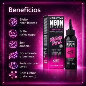 Além de tonalizar, o Keraton Neon Colors ajuda a tratar os cabelos graças à presença de cistina em sua composição. Esse ativo auxilia no fortalecimento da fibra capilar, melhora a elasticidade dos fios e contribui para reduzir a quebra, promovendo um visual mais saudável, bonito e brilhante.