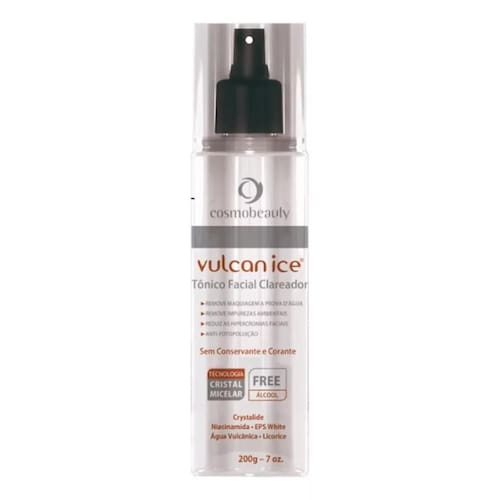 O Tônico Facial Vulcan Ice Clareador é um cuidado diário desenvolvido para remover impurezas e resíduos da pele de forma eficaz e delicada. Sua fórmula conta com tecnologia Cristal Micelar, que promove sensação de limpeza profunda e frescor, ajudando a manter a pele com aspecto uniforme e luminoso. Ideal para todos os tipos de pele, inclusive as mais sensíveis.Benefícios e característicasClareadorRemove maquiagem à prova d’águaElimina impurezas ePromove sensação de pele limpa e revitalizadaTextura suave e refrescanteSem conservantesSem corantesAtivos presentesCrystalide, Niacinamida, EPS White, Água Vulcânica e Licorice.Modo de usarBorrife o produto sobre um algodão e aplique delicadamente por todo o rosto. Não é necessário enxaguar.