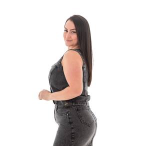 Possui fechamento frontal com botões encapados, barra levemente curvada e alças largas que garantem segurança e conforto. A modelagem estilo corset destaca a cintura e combina perfeitamente com saias, calças ou shorts jeans, criando produções coordenadas.