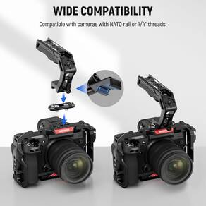 -?Alça superior universal com um trilho NANO de 48 mm?Para montagem rápida e simples, o NEEWER CA008 Top Handle Grip é compatível com qualquer trilho da OTAN e suporta ajuste de posição livre. Compatível com plataformas SmallRig e gaiolas pequenas. O acessório ferroviário OTAN de 48 mm incluído pode caber em uma gaiola de câmera por meio de dois parafusos de 1/4" e também possui botões de liberação rápida para montagem instantânea e prevenção de quedas, com uma capacidade máxima de carga de 22 lb/10 kg