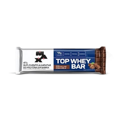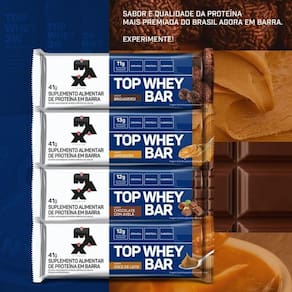 Top Whey Bar (41g) - Sabor: Chocolate C/ Avelã Top Whey Bar (41g) Top Whey Bar apresenta um blend de proteínas: Whey Protein Concentrado, Caseinato de Calcio e Colágeno Hidrolisado, e um recheio cremoso, trazendo mais maciez para a barra. Uma parte do carboidrato presente na barra é maltitol (poliól), que apresenta a vantagem de um menor consumo calórico do que açúcares, (2.4kcal vs 4kcal por g de alimento) e uma resposta glicêmica reduzida comparado com a sacarose. Top Whey Bar pode ser consumida no seu lanche, a qualquer momento do dia. Também pode ser consumida no pós-treino e, para quem gosta de doces, é uma excelente opção para substituição ou, como sobremesa! --* Top Whey Bar é uma barra proteica que oferece praticidade e muito sabor. Benefícios: - Aporte de proteínas;- 11 a 13g de proteína por barra;- Com Whey Protein Concentrado;- Até 2,4g de fibra alimentar;- Auxiliam na formação dos músculos e ossos;- Pode ser usada como lanche intermediário;- Macia e muito saborosa.