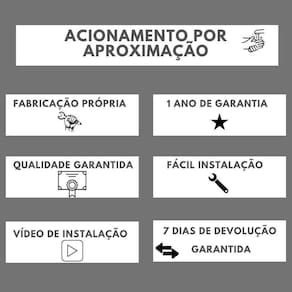 Torneira eletrônica de mesa on-off em latão cromadoTorneira com sensor automática bivolt, ideal para lavatórios profissionais, consultórios, clínicas, banheiros públicos e banheiros para deficiente. A torneira sensorizada de mesa cromada reúne praticidade e conforto para a correta higienização de mãos em qualquer local, evitando a contaminação cruzada em aplicações profissionais. A torneira se adapta facilmente a diversos modelos de pias e cubas e dispensa o contato manual, pois é acionada automaticamente por meio de sensores de presença, gerando economia de até 70% de água, atendendo as exigências da vigilância nbr 9050 .Produto nacional com garantia de até 1 ano para qualquer defeito de fabricação e assistência técnica. É um produto composto de 4 módulos: sensor, fonte, válvula e módulo eletrônico. Reduzindo assim, o custo da manutenção.Funcionamento:Passar a mão em frente do sensor da torneira eletrônica para ligar.Passar a mão novamente em frente do sensor da torneira eletrônica para desligar ou então, a torneira eletrônica vai desligar no tempo programado. A programação para desligar a torneira eletrônica, poderá ser feito a qualquer momento.Praticidade: utilizando a torneira eletrônica, você terá água, mesmo com as mãos ocupadas;Higiene: utizando a torneira com sensor, você evitará contaminação cruzada;Economia: utilizando a torneira sensorizada, você utilizará somente a água que necessita, assim, evitará o desperdício e economizará até 70%;Meio ambiente: utilizando a torneira eletrônica, você estará contribuindo para um mundo mais sustentável.Instalação:- colocar a torneira eletrônica no furo da pia, passar o cabo do sensor, juntamente com o tubo roscado da bica no furo da pia ou bancada.- embaixo da pia ou bancada, passar o cabo do sensor, que vem da torneira eletrônica, no anel de vedação e na flange.- rosquear a flange na torneira eletrônica, até fixar a bica na pia ou bancada.- rosquear a válvula lado macho na entrada da água, depois rosquear o engate no lado fêmea da válvula. Utilizar fita teflon para evitar vazamentos.- rosquear o engate no tubo roscado na base da torneira eletrônica. Não utilizar fita teflon.- conectar o cabo do sensor no módulo da válvula.- ligue o cabo da energia elétrica para o funcionamento da torneira eletrônica.Informações técnicas:- tensão de alimentação da torneira eletrônica: bivolt.- pressão de funcionamento da torneira eletrônica: mínima 0,2 kgf/cm e máxima 8,0 kgf/cm , equivalente a coluna de 2m e 80m respectivamente.- conexão roscável da torneira eletrônica: polegada.- cabo de energia da torneira eletrônica: 1,2m de comprimento- cabo do sensor da torneira eletrônica: 60 cm de comprimento- consumo da torneira eletrônica: 0,3w em repouso e 6,6w quando acionada.- torneira eletrônica: latão cromado com altura de 14cm entre a base e saída da água .- regulagem para da sensibilidade do sensor no módulo eletrônico.