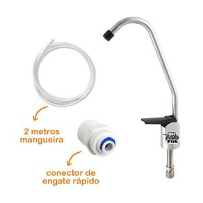 Além da torneira, o kit também inclui um conector engate rápido de 1/2 para 1/4, facilitando a instalação. E para completar, o produto acompanha 2 metros de mangueira branca.