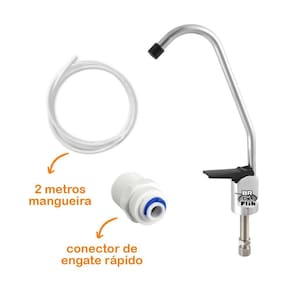 Além da torneira, o kit também inclui um conector engate rápido de 1/2 para 1/4, facilitando a instalação. E para completar, o produto acompanha 2 metros de mangueira branca.