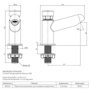 Torneira Blukit Temporizada em ABS De Mesa Cromado - As torneiras temporizadas Blukit têm como principal função diminuir o desperdício de água. Fabricada em ABS, seu funcionamento automático temporizado, gera economia de até 70%. Com um tempo de fechamento entre 4 a 10 segundos, libera apenas a quantidade necessária para cada acionamento. De instalação simples e manutenção rápida, são ideais para o uso em ambientes coletivos, como banheiros, estádios, rodoviárias, escolas, aeroportos e parques. Além disso, o produto possui fabricação nacional, proteção a raios UV, suporta baixa e alta pressão e acompanha redutor de vazão.Características Gerais do Produto: Marca: Blukit Bica: Baixa Bica Móvel: Não Instalação: Bancada Arejador: Fixo Material: ABS Garantia: 12 Meses Fabricante Acompanha o produto: 1 Torneira Temporizada Blukit 1 Canopla 1 Flange 1 Vedante 1 redutor de vazãoGarantia: 12 Meses Fabricante