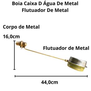 Características Técnicas: - Torneira Boia de Pressão - Corpo, haste e boia/flutuador em metal - Diâmetro nominal de 25mm 3/4 polegada - Comprimento: 44,0 cm - Largura: 13,0 cm