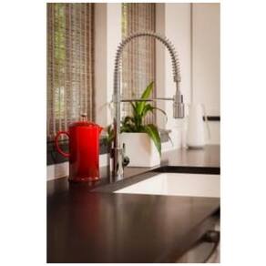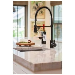 Feita de latão e zinco com acabamento em aço inoxidável, esta torneira de cozinha de pré enxágue de furo único é durável e resistente. Medindo 52,22 cm e girando 360 graus, esta torneira com bica de mola é a escolha ideal para sua cozinha moderna. Além disso, ela pode ser montada em deck de até 6,35 cm de espessura, tornando a a escolha certa para qualquer projeto de instalação.