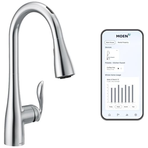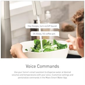 A tecnologia Moen Smart Faucet foi desenvolvida para facilitar as atividades diárias na cozinha, com controle preciso de temperatura e medição exata. Com quatro métodos de controle voz, aplicativo, viva voz ou manual a torneira inteligente oferece predefinições personalizáveis para medições e temperaturas exatas, tornando as tarefas diárias mais fáceis. A torneira é ativada por voz e viva voz, independentemente da posição manual da alça, sendo a única torneira de cozinha ativada por voz no mercado comercial. O sensor de onda automático permite que o fluxo de água seja iniciado e interrompido com um simples movimento da mão, proporcionando conveniência mãos livres. O design versátil com acabamento cromado altamente reflexivo funciona com qualquer estilo de decoração. Para controle de voz, é necessário um smartphone, alto falante Amazon ou Google Smart e internet sem fio.