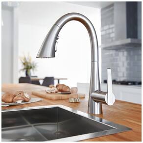 A Torneira de Cozinha PullDown GROHE Zedra com Pulverizador TripleFunction é uma opção elegante e contemporânea para a cozinha moderna. Com um design fino e de furo único, ela apresenta um pulverizador ergonômico e alargado que permite alternar entre três funções de jato fluxo regular para encher panelas, spray de chuveiro para enxaguar a pia ou lavar frutas e um poderoso spray de lâmina para limpar rapidamente os alimentos dos pratos. A torneira é cuidadosamente projetada para lidar com todas as tarefas da cozinha, além de ser fácil de instalar em pias e bancadas de furo único, com mangueiras incluídas. A alça rotativa para a frente não interfere com backsplash e a torneira gira 360 graus para acesso fácil a todos os cantos da pia da cozinha. Possui acabamentos duráveis, com o revestimento GROHE StarLight que mantém o brilho em acabamentos escovados e polidos. A torneira de cozinha Zedra é tão elegante quanto eficiente, com a engenharia alemã de qualidade para garantir desempenho à prova de vazamentos, além do controle e operação suaves e precisos da alça com o GROHE SilkMove.
