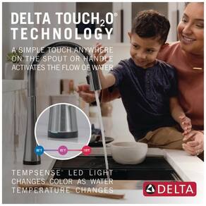 A torneira de cozinha Monrovia Kitchen Collection é uma peça escultural com um design marcante nos puxadores. Com a tecnologia Delta Touch2O, é possível ativar o fluxo de água com um simples toque em qualquer lugar da bica ou alça com o pulso ou antebraço, mantendo a torneira limpa mesmo com as mãos sujas. A luz LED Delta TempSense muda de cor para alertar sobre a temperatura da água e evitar surpresas ou desconfortos. O encaixe MagnaTite usa um ímã poderoso para manter o pulverizador de cozinha no lugar e evitar quedas. A tecnologia patenteada DIAMOND Seal reduz os pontos de vazamento e garante uma operação sem vazamentos durante a vida útil da torneira. A instalação é fácil e pode ser feita em configurações de furo único ou 3 furos de 20 cm. Os acabamentos Delta Lumicoat são resistentes a manchas de água e fáceis de limpar com orifícios de spray TouchClean. Além disso, a torneira está em conformidade com a legislação sem grafite.