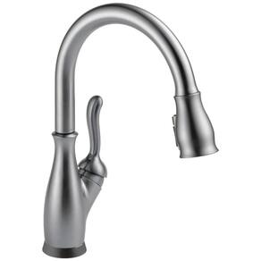 A coleção de cozinha Leland combina estilo tradicional com funcionalidade moderna. As torneiras Delta Touch2O possuem tecnologia Touchless, o que ajuda a manter germes e sujeira longe da torneira da cozinha. Além disso, a tecnologia ShieldSpray limpa com precisão semelhante à do laser, enquanto um jato concentrado elimina sujeiras teimosas. A luz LED TempSense muda de cor para alertar sobre a temperatura da água e o MagnaTite Docking usa um ímã poderoso para manter o bastão de pulverização no lugar quando não está em uso. As torneiras Delta com tecnologia Diamond Seal reduzem os pontos de vazamento e duram o dobro do padrão da indústria. Você pode escolher entre os modos Touch2O com Touchless ou Touch2O apenas. A ativação Touchfree ajuda a manter sua torneira livre de bagunça, reduzindo a limpeza. O desligamento automático do fluxo de água após quatro minutos ajuda a economizar água. A instalação é fácil e há vídeos de instalação passo a passo disponíveis no YouTube da Delta Faucets.