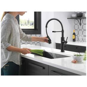 A torneira de cozinha Delta MagnaTite Docking possui um sistema de encaixe magnético que mantém o pulverizador pull down no lugar com precisão. A tecnologia DIAMOND Seal reduz os pontos de vazamento e aumenta a durabilidade da torneira, que dura duas vezes mais que o padrão da indústria. O encaixe é fácil de instalar em furos únicos ou de 7 cm, com linhas de fornecimento InnoFlex PEX integradas para reduzir os pontos de vazamento. O design moderno em preto fosco oferece um estilo comercial casual. A torneira possui um pescoço de ganso de alto arco que gira 360 graus e uma mangueira retrátil de 50 cm para maior conveniência na cozinha. A varinha de duas funções possui jato aerado ou spray. Não há menção à garantia ou suporte.