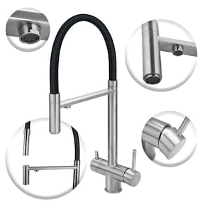 Torneira cozinha gourmet inox preto monocomando saída filtro Torneira gourmet cozinha monocomando inox preto com saída para filtro Leve modernidade, praticidade e sofisticação para sua cozinha com a torneira gourmet monocomando em inox preto. Com design funcional e acabamento premium, ela é ideal para quem busca desempenho e estilo no dia a dia. Dimensões e especificações: - altura total: 57 cm - largura total: 25 cm - medida do furo recomendada: 37mm de diâmetro - saída extra para filtro: mais praticidade no uso diário - tipo de montagem: montagem na pia, ideal para cozinhas com bancadas espaçosas, proporcionando um visual organizado e funcional. - 3 meses de . Obs: não acompanha filtro Funcionalidade e uso: - monocomando misturador: facilita o controle da temperatura e do fluxo de água com uma única alavanca, permitindo ajustes precisos para obter a temperatura ideal. - flexibilidade: o tubo flexível permite movimentar a torneira em várias direções, oferecendo maior alcance e facilidade na limpeza de utensílios e áreas ao redor da pia. - além da função principal, essa torneira vem com uma saída extra para ligar diretamente ao seu filtro de água, oferecendo ainda mais funcionalidade no seu dia a dia. - a temperatura máxima de utilização do produto é de 70ºc - deve ser instalado em um ponto com no mínimo de 40 kpa / 4 m.C.A. Para aquecedor de acumulação, no mínimo 60 kpa/6 m.C.A. Para aquecedor de Passagem e no máximo 400 kpa / 40m.C.A. metro de coluna de água . Use fita veda rosca não incluso nas conexões de entrada, se necessãrio, não utilize qualquer outro tipo de vedante. materiais e durabilidade: - construção: fabricada com materiais de alta qualidade, combinando aço inoxidável com revestimento flexível, garantindo durabilidade e resistência à corrosão. - acabamento: o acabamento preto é elegante e moderno, resistente a manchas e fácil de limpar, mantendo a torneira com uma aparência nova por mais tempo. Recomendações de uso, manutenção e limpeza: limpar a torneira apenas com um pano macio e sabão neutro. Não usar produtos abrasivos como: sapólio, palha de aço e produtos químicos. Marca: Não Informado Ean: 0074468275430
