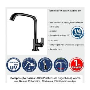 Torneira Cozinha de Mesa Lorenzetti Fitt Abs Preta 1/4 de Volta Marca: Lorenzetti Modelo: 7111082 (1167 F61) Material de fabricação: ABS (Plástico de Engenharia); Cor: Preto Proteção: Acabamento com proteção UV e tratamento anticorrosivo) Mecanismo: Cerâmico 1/4 de volta Pressão mínima de funcionamento: 1,5 mca Pressão máxima de funcionamento: 40 mca Temperatura máxima de funcionamento: 50ºC Arejador embutido: Economiza água e evita respingos Bitola móvel: Giro de 360º Bitola: 1/2' (DN15) Altura total: 30,2 cm Altura queda d'água: 20,3 cm Comprimento: 15,7 cm Largura: 8,1 cm Garantia: 12 meses
