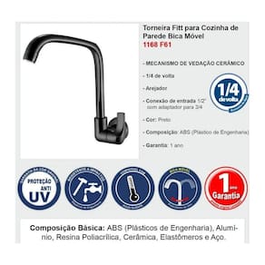 Torneira Cozinha de Parede Lorenzetti Fitt Abs Preta 1/4' de volta Marca: Lorenzetti Modelo: 7111084 1168 F61 Material de fabricação: ABS Plástico de Engenharia ; Cor: Preto Proteção: Acabamento com proteção UV e tratamento anticorrosivo Mecanismo: Cerâmico 1/4 de volta Pressão mínima de funcionamento: 1,5 mca Pressão máxima de funcionamento: 40 mca Temperatura máxima de funcionamento: 50ºC Arejador embutido: Economiza água e evita respingos Bitola móvel: Giro de 360º Bitola: 1/2' DN15 Altura total: 23,4 cm Altura queda d'água: 16,0 cm Comprimento: 21,8 cm Largura: 8,4 cm Garantia: 12 meses Ean: 7896451874047