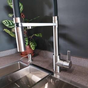 Fabricada em aço inox 304, essa torneira oferece alta durabilidade, resistência à corrosão e confiabilidade, além de apresentar um design elegante na cor prata escovada, que adiciona um toque de sofisticação e neutralidade à sua cozinha.
