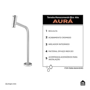 A Torneira de Banheiro Monocomando Alta Aurá combina design elegante e funcionalidade. Produzida em aço inox 201, é resistente à corrosão e garante durabilidade no uso diário, além de a instalação ser diretamente na bancada, oferecendo praticidade e acabamento refinado.