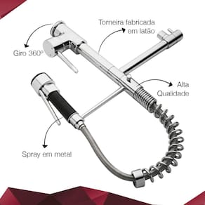 - Altura Total (Presa): 50 cm - Altura Total (Solta): 56 cm - Largura Da Base: 5 cm - Distância Da Base Até A Queda D'água Da Bica Fixa: 16 cm - Distância Da Base Até a Ducha Manual (spray) Presa: 8 cm - Conexão: 1/2 - Peso: 1.814 kg - Material Do Corpo: Latão - Material Do Gatilho: Latão - Pressão Mínima Para Funcionamento: 3 m.c.a - Arejador (Bica Fixa): Com Arejador - Furo De Instalação: 3,2 cm - Tipo de Flexível: Espiralado - Acabamento: Cromado - Área Indicada: Cozinha