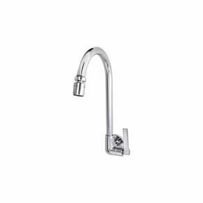 Torneira metálica robusta, com design moderno, combinando formas circulares.