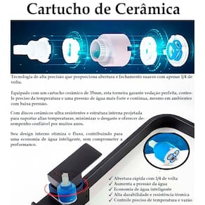 Cartucho Cerâmico de 35mm: Garante vedação perfeita, controle preciso da temperatura e fluxo contínuo mesmo em locais com baixa pressão. Conta com discos cerâmicos ultra resistentes, projetados para suportar altas temperaturas com o mínimo de desgaste.