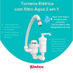 Torneira elétrica de bancada com filtro água 3t 220v 4400w tfb244 - sintex - A torneira elétrica de bancada com filtro água 2 em 1 sintex é a opção ideal para quem busca um produto de qualidade e eficiência. Com design moderno e compacto, a torneira é ideal para instalação em bancadas. A bica alta giratória permite um maior alcance e direcionamento do jato de água, enquanto o arejador integrado reduz o consumo de água em até 35%. O filtro de alta performance possui carvão ativado e remove impurezas e sedimentos da água como cloro, odores, proporcionando água limpa e saudável para consumo e para as atividades domésticas. Beneficíos: Design moderno e compacto Bica alta giratória Arejador integrado Filtro de alta performance Fácil instalação e uso Resistência de troca rápida de 1 ano Detalhes técnicos: Voltagem: 220v Potência: 4400w Disjuntor: 20a Vazão l/min: 3,9 Fiação do produto: 2,5mm Pressão de funcionamento mínimo: 20 k pa 2 metros por coluna d'água Pressão de funcionamento máximo: 400 k pa 40 metros por coluna d'água Características gerais do produto: Bica: alta Cor: branco : 1 ano junto ao fabricante Material: plástico de engenharia Acompanha o produto: 1 torneira elétrica com filtro 1 1 manual de instruções : 1 ano de direto com o fabricante