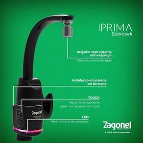 Torneira Eletronica Prima Touch Black 5500w 220v - Zagonel Torneira Eletronica Prima Touch Black 5500W 220V - Zagonel Primeira torneira com tecnologia TOUCH do mercado nacional, a torneira Prima Black Touch foi pensada para ser conceito de conforto e funcionalidade desde sua instalação. Traz em seu design linhas elegantes e modernas, com bica giratória, além da possibilidade de instalação em bancada ou parede.